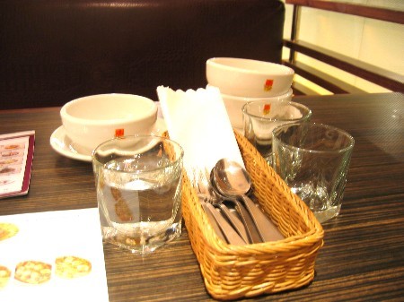 桌上已擺好水杯跟餐具,後面的碗盤是要讓你分享餐時用的.